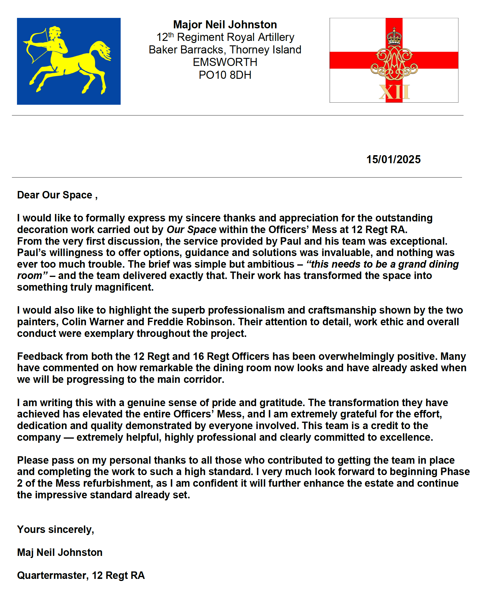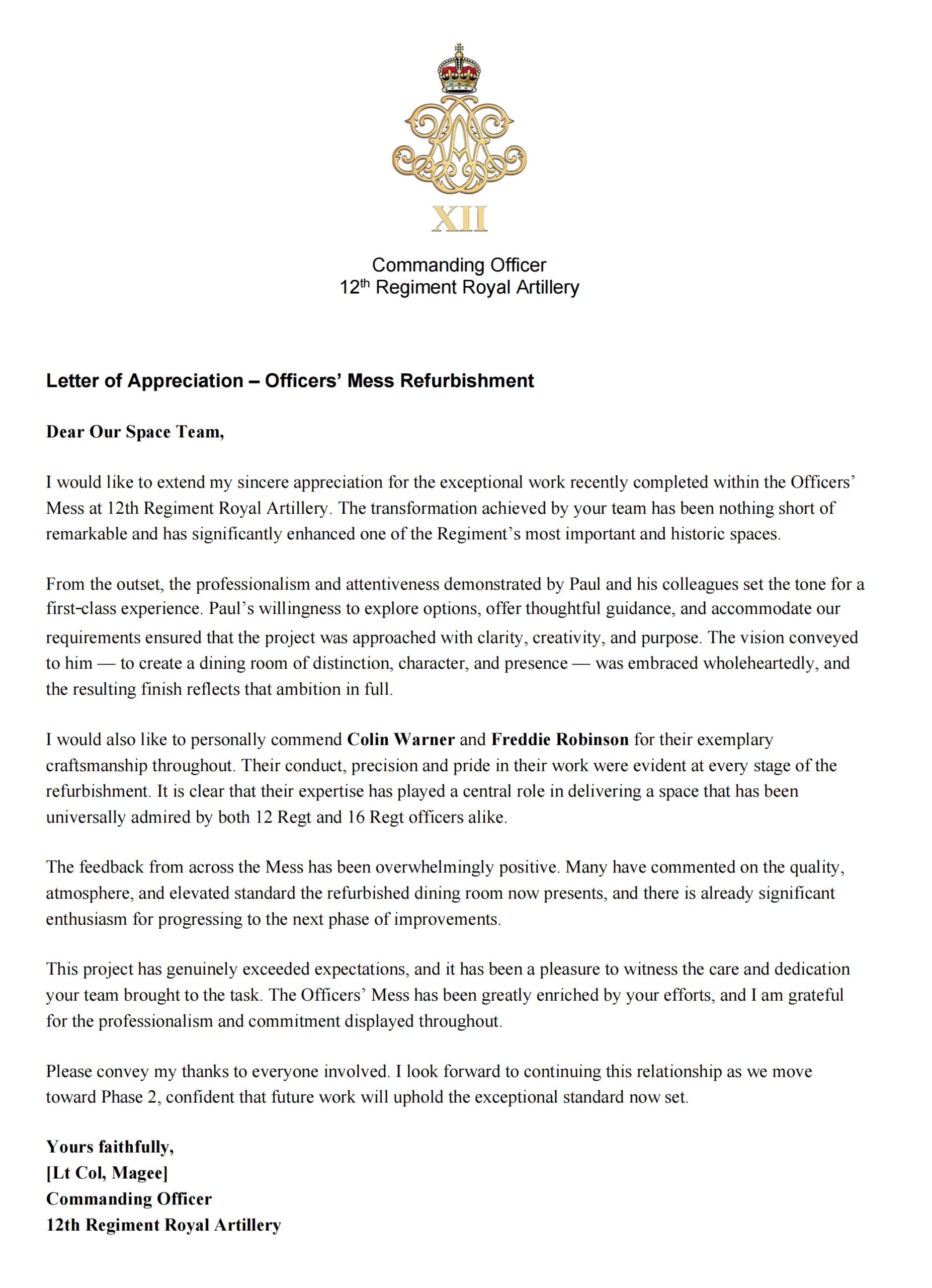 OurSpace was appointed to carry out the full decorative refurbishment of the Officers’ Mess dining room at 12th Regiment Royal Artillery. The brief was to transform the space into a grand and distinguished dining room that reflected the importance and heritage of the Mess.